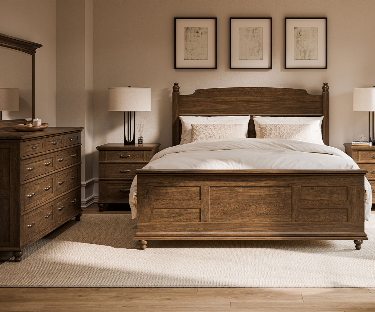 This Collection Includes: • Plymouth Bun Feet Bed • Armoire • Dresser • Door Chest • Ladies Dressing Chest • Chest of Drawers • Lingerie Chest • Nightstand