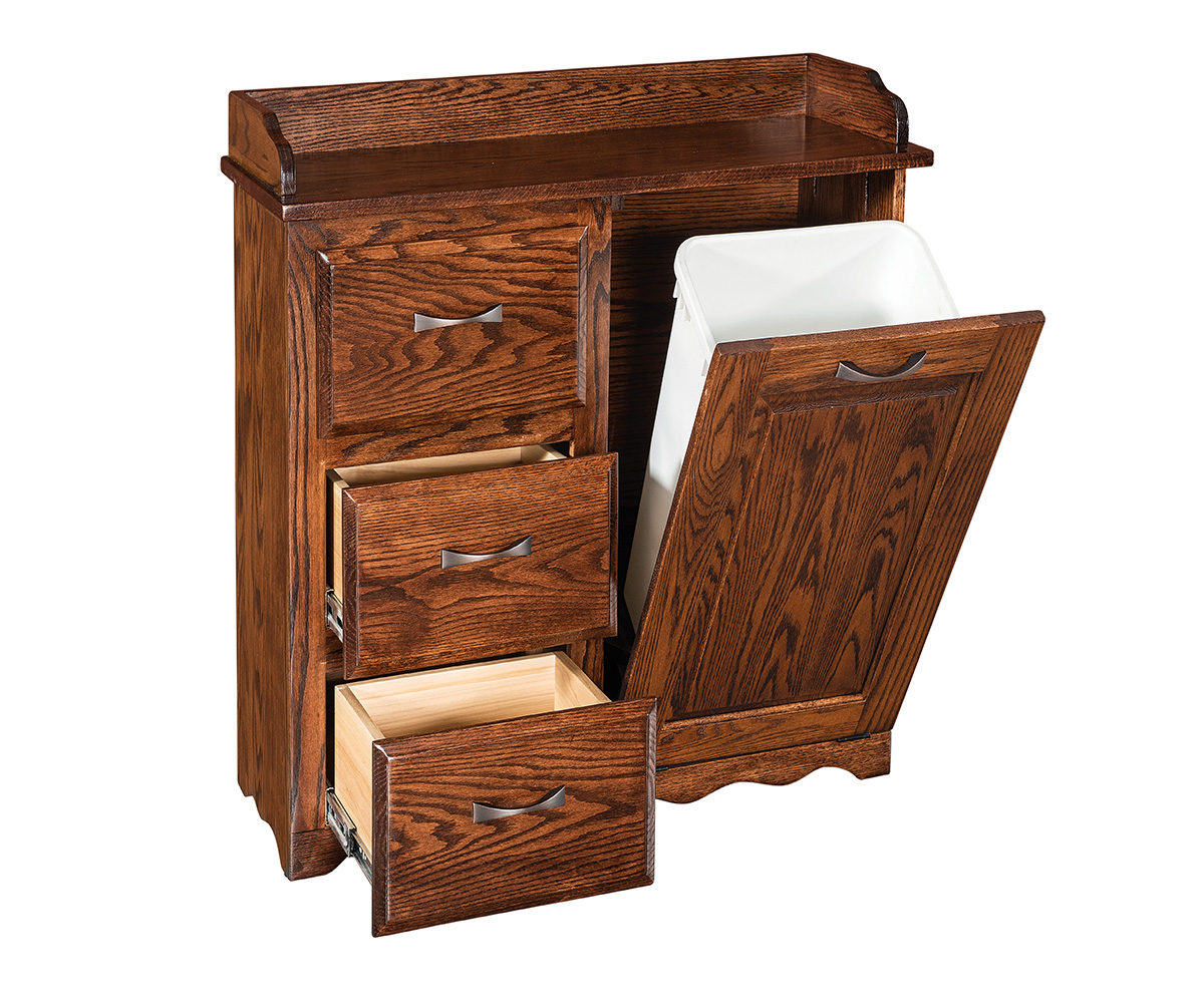 Features: • Dovetailed drawers on left side • Full extension drawer slides • Front panel tilts forward for easy access • A 50 qt trash can fits inside